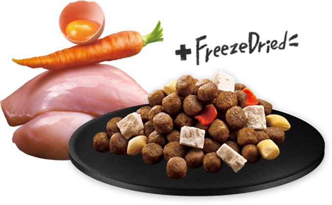 嚴選大塊雞肉與鮮蛋凍乾,搭配香甜胡蘿蔔切片,美味加倍